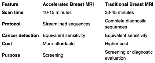 Accelerated Breast MRI (also called abbreviated breast MRI or AB-MRI) is a shortened, streamlined version of a traditional breast MRI that takes just 10-15 minutes while providing the same exceptional cancer-detection capabilities. This fast, radiation-free imaging test uses powerful magnets and radio waves to create detailed images of breast tissue, detecting cancers that mammograms often miss.